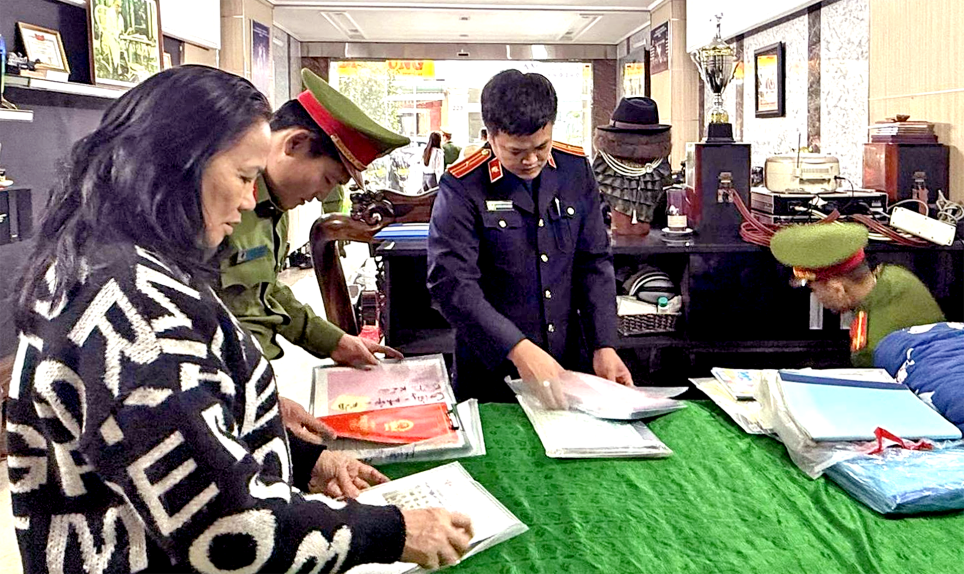 Khám xét tại Công ty TNHH thương mại vàng bạc Kim Chung, lực lượng công an đã phát hiện, thu giữ nhiều miếng kim loại màu vàng cùng các giấy tờ, tài liệu khác có liên quan đến việc kinh doanh của công ty và hành vi trốn thuế.